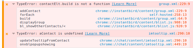 00:32:07 --> jsgrant has joined #instantbird 00:35:48 <-- jsgrant has quit (Quit: Peace Peeps. o/ If you need me asap, message me at msg([at])jsgrant.io & I'll try to get back to you within 24-36 hours.) 01:16:29 <-- Suiseiseki has quit (Quit: Leaving) 01:23:47 --> mconley|livehacking has joined #instantbird 01:29:43 <-- mconley|livehacking has quit (A TLS packet with unexpected length was received.) 01:33:57 --> clokep_work has joined #instantbird 01:33:58 * ChanServ sets mode +o clokep_work 01:56:15 <-- clokep_work has quit (Ping timeout: 121 seconds) 02:00:48 --> mconley|livehacking has joined #instantbird 02:17:18 <-- Jackneill has quit (Ping timeout: 121 seconds) 02:56:05 <-- mconley|livehacking has quit (Quit: NO CARRIER) 03:31:45 <instant-buildbot> build #3604 of macosx-nightly-default is complete: Success [3build successful] Build details are at http://buildbot.instantbird.org/builders/macosx-nightly-default/builds/3604 03:58:41 --> Suiseiseki has joined #instantbird 04:16:26 <-- bgmCoder has quit (Ping timeout: 121 seconds) 04:59:02 --> Bollebib has joined #instantbird 05:55:15 <-- Bollebib has quit (Ping timeout: 121 seconds) 05:56:24 --> antare269 has joined #instantbird 06:36:05 --> ecmuller has joined #instantbird 06:37:41 <-- ecmuller_ has quit (Ping timeout: 121 seconds) 06:37:44 --> gerard-majax has joined #instantbird 07:01:02 <-- antare269 has left #instantbird () 07:42:44 <-- gerard-majax has quit (Ping timeout: 121 seconds) 08:46:00 --> fredw has joined #instantbird 08:53:29 --> gerard-majax has joined #instantbird 08:58:12 --> Divyang has joined #instantbird 09:00:20 <-- Divyang has quit (Quit: http://www.mibbit.com ajax IRC Client) 09:01:31 <-- fredw has quit (Connection closed) 09:04:08 --> fredw has joined #instantbird 09:23:15 <-- florian has quit (Quit: Instantbird 1.6a1pre -- http://www.instantbird.com) 09:43:47 <-- gerard-majax has quit (Ping timeout: 121 seconds) 10:18:12 --> florian has joined #instantbird 10:18:12 * ChanServ sets mode +qo florian florian 10:28:00 <-- fredw has quit (Client exited) 11:15:13 --> gerard-majax has joined #instantbird 11:17:46 --> ecmuller_ has joined #instantbird 11:20:16 <-- ecmuller has quit (Ping timeout: 121 seconds) 11:44:29 --> fredw has joined #instantbird 11:47:22 --> Jackneill has joined #instantbird 12:12:24 --> clokep_work has joined #instantbird 12:12:24 * ChanServ sets mode +o clokep_work 13:32:47 --> cha-cha has joined #instantbird 13:38:38 <-- cha-cha has quit (Quit: Instantbird 1.6a1pre -- http://www.instantbird.com) 13:39:09 --> cha-cha has joined #instantbird 14:16:37 <-- cha-cha has quit (A TLS packet with unexpected length was received.) 14:29:49 --> bgmCoder has joined #instantbird 14:36:43 --> cha-cha has joined #instantbird 14:45:39 <-- cha-cha has quit (A TLS packet with unexpected length was received.) 15:15:59 <-- BWMerlin has quit (Ping timeout: 121 seconds) 15:30:31 <instantbot> New Chat Core - Matrix bug 1378823 filed by pavankarthikboddeda@gmail.com. 15:30:33 <instantbot> Bug https://bugzilla.mozilla.org/show_bug.cgi?id=1378823 nor, --, ---, nobody, NEW, Add basic Tooltip info. 15:36:04 <instantbot> New Chat Core - Matrix bug 1378827 filed by pavankarthikboddeda@gmail.com. 15:36:05 <instantbot> Bug https://bugzilla.mozilla.org/show_bug.cgi?id=1378827 nor, --, ---, pavankarthikboddeda, NEW, Implement Presence and Presence Status. 15:48:02 --> Bollebib has joined #instantbird 15:50:45 <-- fredw has quit (Client exited) 15:56:01 <-- gerard-majax has quit (Ping timeout: 121 seconds) 16:12:57 * matrixisreal[M] posted a file: contacserror (24KB) - https://matrix.org/_matrix/media/v1/download/matrix.org/qfrBDWNKqHCRuKgIxJarAcgO 16:14:07 * matrixisreal[M] uploaded an image: contacserror.png (24KB) - https://matrix.org/_matrix/media/v1/download/matrix.org/ArYiJyXRgZGTYbhBTkUnmKIK 16:15:16 <matrixisreal[M]> Working on contacts, looks like I have something broken in build/or some bug. 16:16:26 <matrixisreal[M]> This is how the window looks like. 16:16:36 * matrixisreal[M] uploaded an image: contactswindow.png (16KB) - https://matrix.org/_matrix/media/v1/download/matrix.org/yiDFZwureWXbWXoccRXlDTHf 16:18:14 <matrixisreal[M]> clokep_work: Anything to say abt this ? 16:19:05 <clokep_work> matrixisreal[M]: Nothing off the top of my head, seems like something is broken. 16:19:11 <clokep_work> I'd try reverting all your patches and building first. 16:19:48 <matrixisreal[M]> build whole thing ? 16:19:56 <clokep_work> What? 16:19:58 <matrixisreal[M]> clokep_work: 16:20:09 <clokep_work> What? 16:20:13 <clokep_work> I don't understand the question. 16:20:17 <clokep_work> You need to rebuild *something*. 16:20:17 <matrixisreal[M]> I mean, a complete build ? :P 16:20:23 <clokep_work> You can try by building just the im/chat stuff first. 16:20:28 <clokep_work> If that doesn't work, then try a full build. 16:26:42 <matrixisreal[M]> just im build didn't work, trying out complete build. 16:28:40 --> gerard-majax has joined #instantbird 16:31:02 <clokep_work> OK. 16:39:07 <-- mook_as has quit (Quit: ) 16:39:49 --> mook_as has joined #instantbird 16:58:19 <-- gerard-majax has quit (Ping timeout: 121 seconds) 17:02:27 --> flo has joined #instantbird 17:02:27 * ChanServ sets mode +qo flo flo 17:02:42 --> gerard-majax has joined #instantbird 17:02:46 <-- florian has quit (Ping timeout: 121 seconds) 17:02:47 * flo is now known as florian 17:09:20 <-- gerard-majax has quit (Ping timeout: 121 seconds) 17:12:22 --> gerard-majax has joined #instantbird 17:23:35 <-- florian has quit (Quit: Instantbird 1.6a1pre -- http://www.instantbird.com) 17:41:17 <-- gerard-majax has quit (Ping timeout: 121 seconds) 17:43:46 <matrixisreal[M]> clokep_work: Didn't work :/ 17:44:09 <matrixisreal[M]> I'll try pulling the latest build, and check again. 17:45:21 <clokep_work> Alright. 17:49:56 --> florian has joined #instantbird 17:49:57 * ChanServ sets mode +qo florian florian 18:51:44 * matrixisreal[M] sent a long message: matrixisreal[M]_2017-07-06_18: